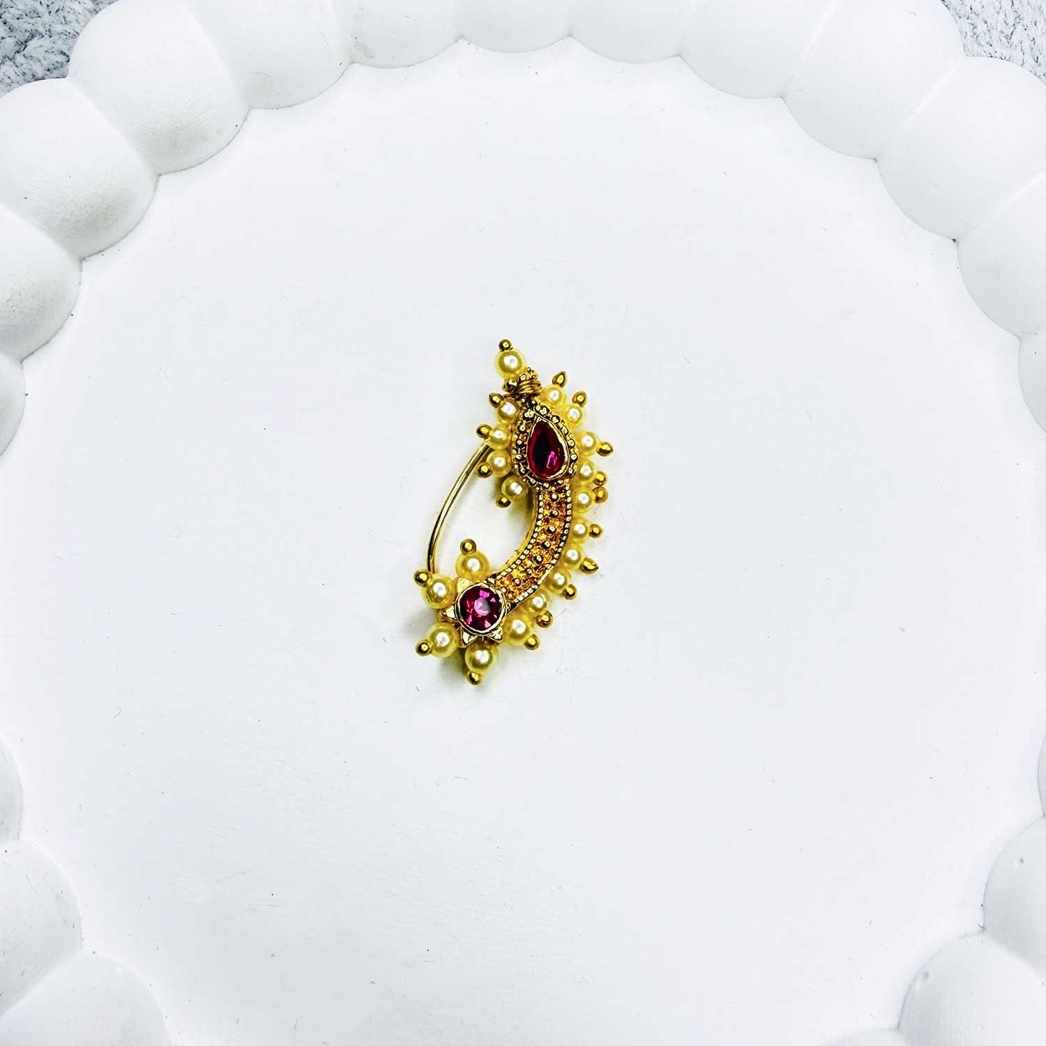 Enhance your traditional look with our beautifully crafted Marathi Nath, inspired by classic Maharashtrian jewelry designs. These elegant nose rings are carefully selected to reflect timeless ethnic style, making them perfect for weddings, festivals, and special occasions.